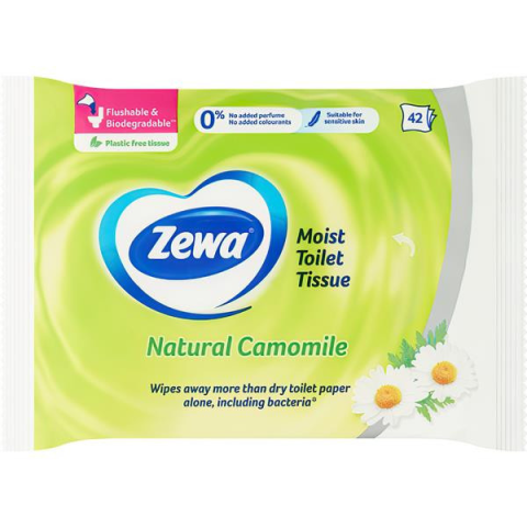 Toalettpapír, nedves, 42db, ZEWA, kamilla Zewa nedves toalettpapír, természetesen gyengéd kamillakivonattal. Tisztaság és frissesség az egész családnak. •Illatmentes •Természetes kamillakivonattal •Bőrsemleges pH-értékű •Toaletten lehúzható és biológi