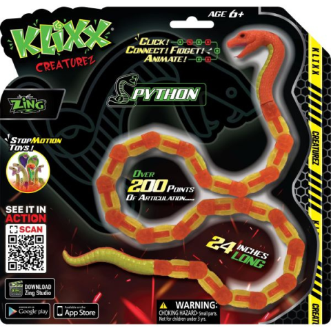 A több mint 200 mozgatható ponttal rendelkező Klixx Creaturez figurákkal az ízeltlábúakért, kétéltűekért és hüllőkért rajongó kicsik és nagyok egy kattogtatható, mozgatható, stop motion videók és rövidfilmek készítéséhez felhasználható, stresszoldó hatású figurával gazdagodhatnak. Ebben a csomagban egy piton rejlik, a csomagolás hátulján a büszke hüllőtulajdonosok érdekességeket olvashatnak az állatról. Klixx Creaturez figurák mint filmsztárok A Klixx