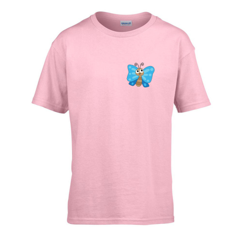 1 kép ZSONA DEKOR Gyerek póló Ovis jelel Kék lepke mintával Rózsaszín 134 méret