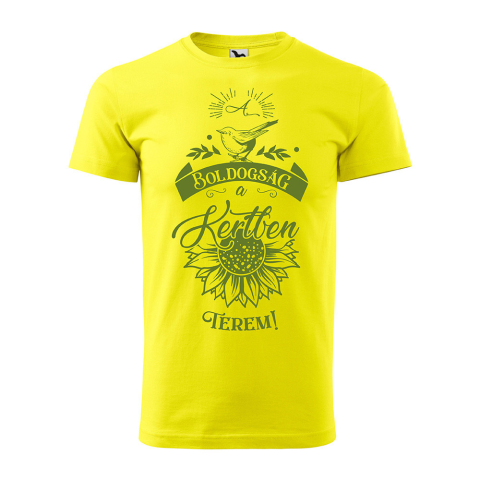 1 kép ZSONA DEKOR Póló A boldogság a kertben terem! mintával - Sárga S méretben