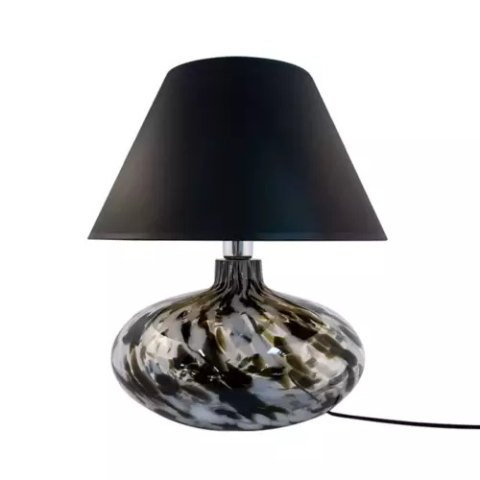 Modern stílusú, szövet ernyős asztali lámpa. A lámpa váza többszínű üveg kombinálásával készül, ettől kapja különleges mintázatát. Az ernyő belül arany színű. A csomagolás a fényforrást nem tartalmazza.