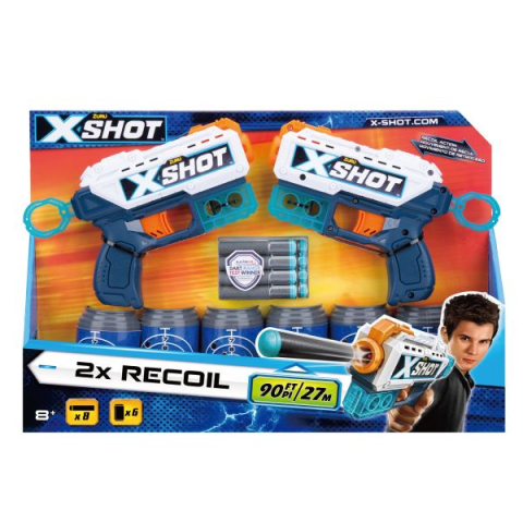 Egy szett, sok lehetőség!Az X-Shot Double Recoil szivacslövő fegyverrel megduplázhatjátok a támadóerőt - vagy játszhattok ketten egymás vagy akár a célpontok ellen. A lőtávolság akár 27 méter is lehet, így igazán izgalmas csaták vannak kilátásban.A szettben 2 darab fegyver, 6 darab üdítősdoboz alakú célpont és 8 darab szivacslövedék található.Gyakorlásra vágytok? Tegyétek ki egymás mellé vagy különböző távolságba a célpontokat, és máris kezdődhet a